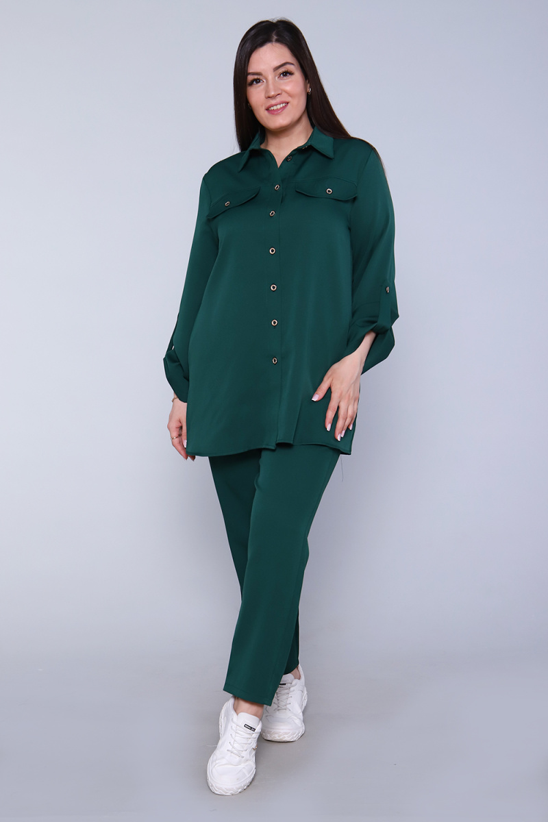 Женский костюм состоит из двух предметов, удобными однотонными брюками на резинке и однотонной туникой рубашечного покроя с двумя накладными нагрудными карманами. Такой костюм не стыдно будет надеть в гости, на работу или просто на вечернюю прогулку. Прекрасно сочетается как с туфлями, так и кроссовками.
