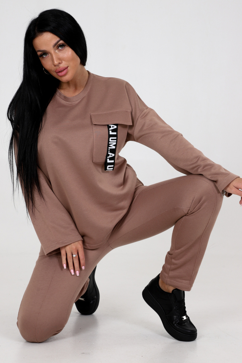 Женский костюм двойка с брюками представляет собой идеальное сочетание стиля и комфорта. Изготовленный из прочной и мягкой трех нитки, этот костюм обеспечивает идеальное сочетание прочности и приятности на ощупь. Туника костюма имеет свободный крой, который позволяет свободно двигаться и не сковывает движения. На полочке туники расположен практичный нагрудный карман, который поможет хранить необходимые мелочи под рукой. Декоративная лента, пришитая по карману и по спинке изделия, придает цельности и оригинальности этому стильному костюму. Особенности полочки изделия, которая короче спинки, и боковые разрезы придают дополнительную элегантность и легкость образу. Кроме того, спущенные рукава делают этот костюм еще более стильным и привлекательным. Брюки костюма имеют удобную резинку, благодаря чему идеально садятся на фигуру и не стесняют движения. Боковые карманы обеспечивают дополнительный комфорт и функциональность. Костюм доступен в двух привлекательных расцветках: коричневой и бирюзовой. Выбирайте цвет, ко